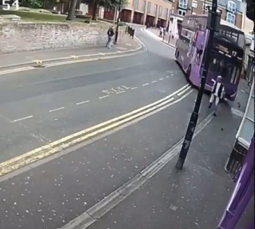 Het bizarre voorval werd vastgelegd door een  stadscamera. Op de beelden is te zien dat de man rustig over straat loopt, terwijl een bus veel te hard de bocht achter hem nadert. Of de chauffeur lag te slapen is niet bekend, maar hij zat zeker niet op te letten.